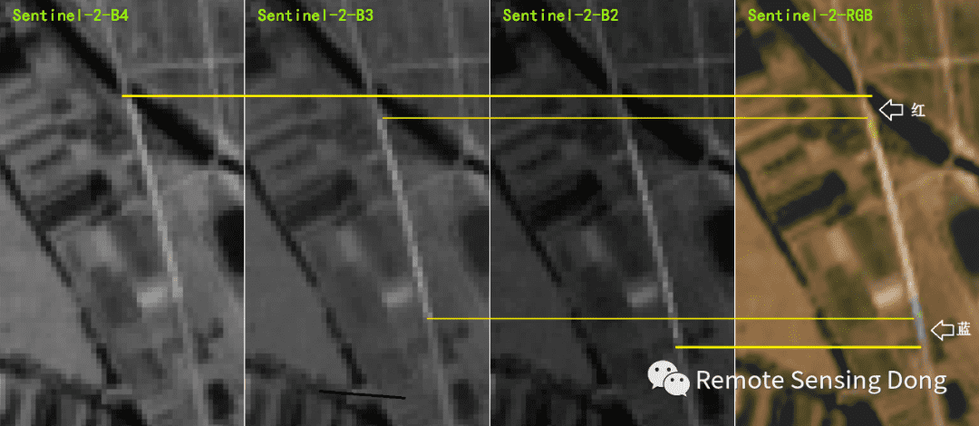 Sentinel-2衛(wèi)星B4 B3 B2的時間差在高鐵目標(biāo)的呈現(xiàn),以及B4 B3 B2合成后的RGB圖像。